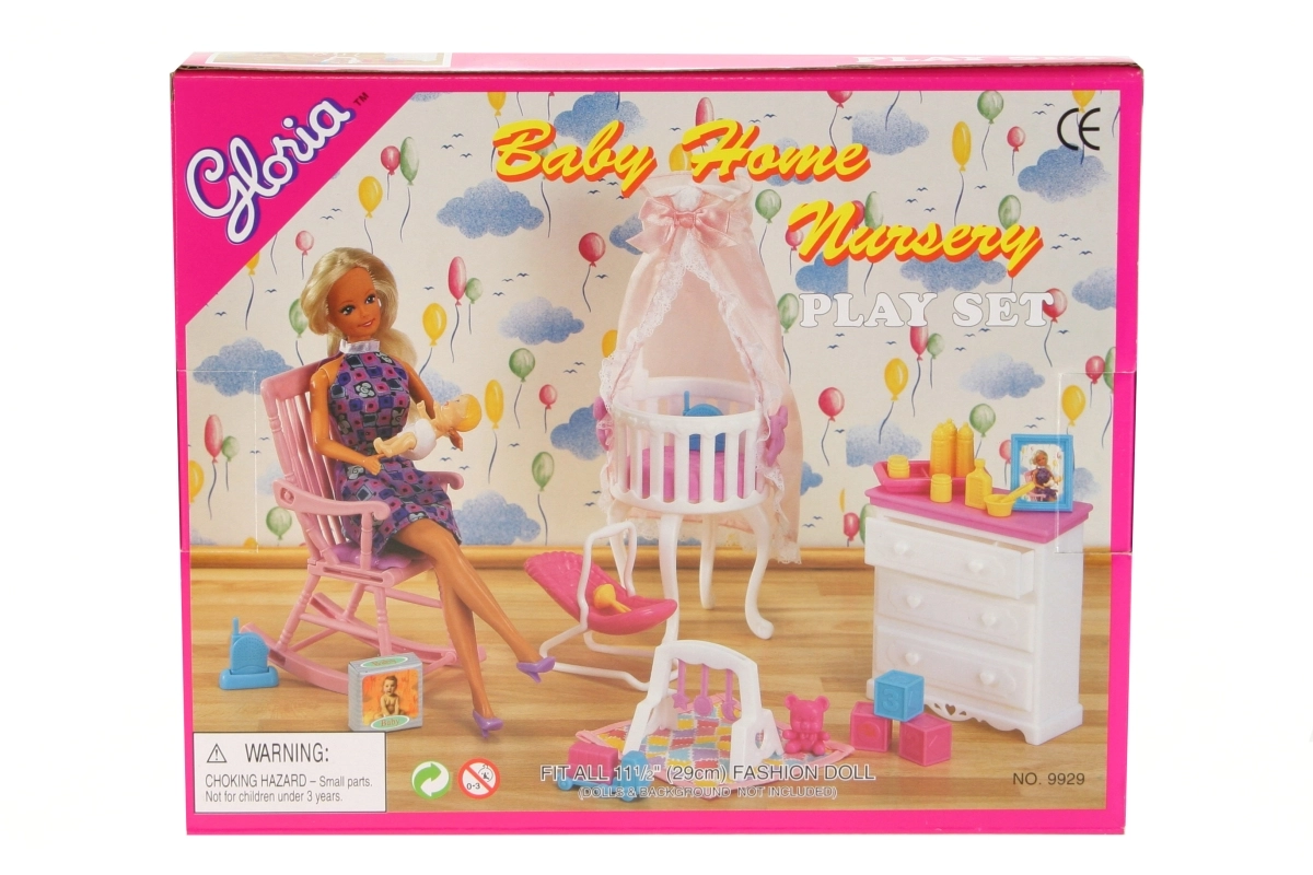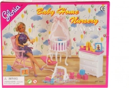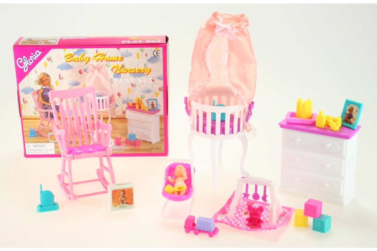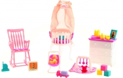 De complete babyset van het merk Glorie biedt alles wat een kinderkamer nodig heeft om met poppen te spelen. Je vindt erin een commode met lade, een ledikantje met hemel, een wipstoeltje, een schommelstoel, accessoires voor de babyverzorging en de baby zelf. Ideaal voor kinderen vanaf 3 jaar om fantasie en zorgvaardigheden te ontwikkelen.