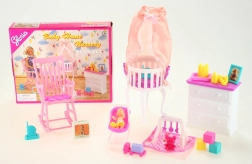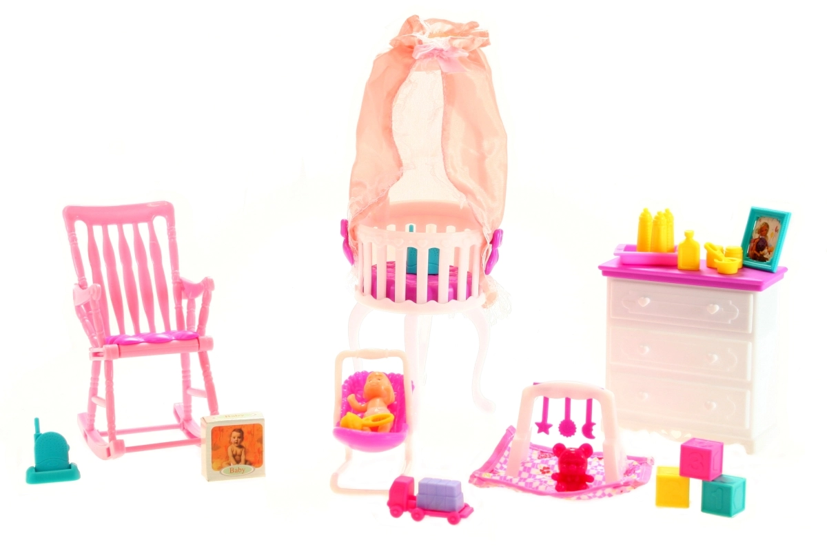 • Complete uitrusting: commode, ledikantje met hemel, wipstoeltje, schommelstoel, speelgoed en benodigdheden voor de baby.