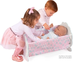De wieg is uitgevoerd in lichtroze en versierd met schattige motieven van zeesterren en een zeemeerminnenstaart. In de verpakking vind je ook een zacht roze kussentje. Pop en flesje zijn niet inbegrepen. Het product is verpakt in een geschenkdoos in de kleuren van de collectie en geselecteerde modellen hebben een QR-code op de verpakking met video-instructies voor eenvoudige montage.