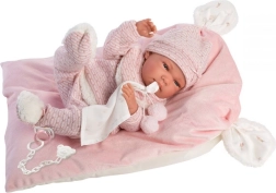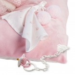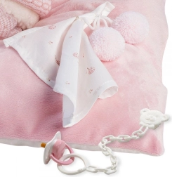 De pop is gekleed in een roze gebreide outfit met een muts en schoentjes voor een realistische look tijdens het spelen.