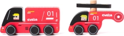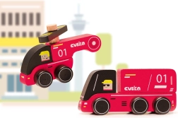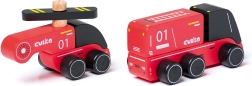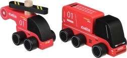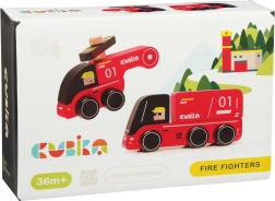 De houten set CUBIKA brandweer bevat één brandweerauto en één helikopter van hoogwaardig esdoorn- en beukenhout. Dankzij de afgeronde randen en veilige, watergedragen verven is hij ideaal voor kinderen vanaf 3 jaar. Certificering TÜV en Europese norm EN 71 garanderen hoge veiligheid. Gemaakt in Europa. Lengte auto 12 cm, helikopter 10 cm.