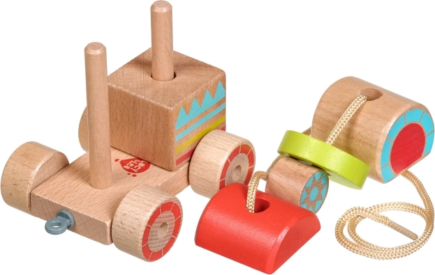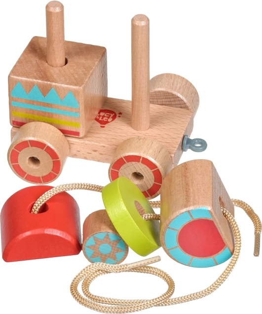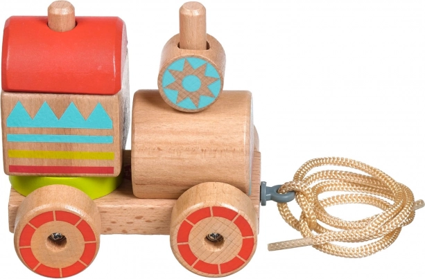 Na het stapelen kan het treintje op pad. Het touwtje van 45 cm is ideaal voor kleine ontdekkers.
