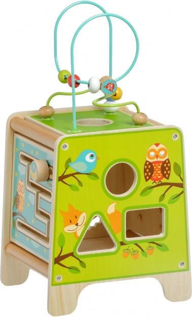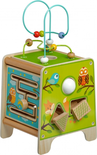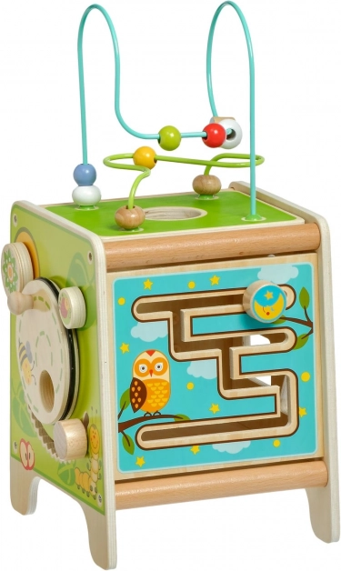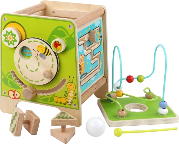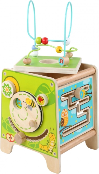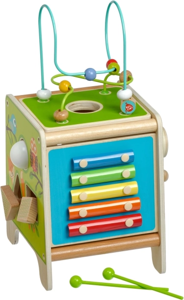 Deze kleurrijke houten activiteitenkubus biedt kinderen uren zinvol spel. Het bovenste kralenlabyrint kan worden verwijderd en omgekeerd in de kubus worden geplaatst voor eenvoudig opbergen. Op de zijkanten ontdekken kinderen een xylofoon met stokjes, een vormenstoof met tweedelige draaiende geometrische vormen, een motorisch doolhof, een roterend wieltje, draaielementen en een leuke activiteit met het verschuiven van een pinnetje in een groef.
