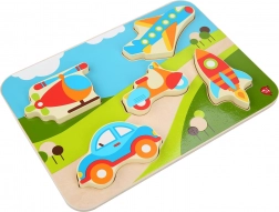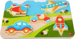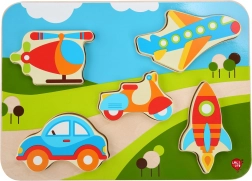 Deze kwalitatieve houten inlegpuzzel met het thema vervoersmiddelen valt op door heldere kleuren en duidelijke vormen die kinderen makkelijk kunnen vastpakken en op hun plek leggen. Sommige stukken kunnen dankzij hun dikte zelfs zelfstandig staan, zodat kinderen er ook los van het bord mee kunnen spelen.