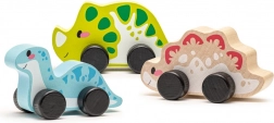 De set bevat drie houten dinosaurussen met wieltjes voor soepel bewegen, ideaal voor jonge kinderen.