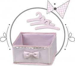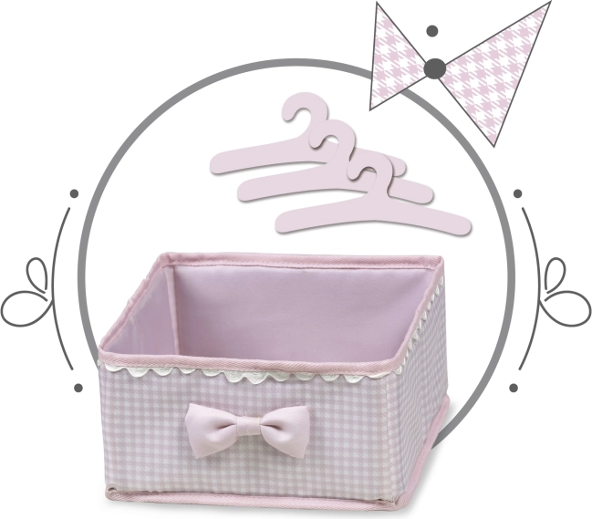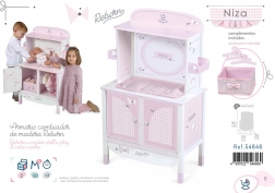 Ontdek de subtiel roze Niza-collectie met deze mooie en praktische poppenkast, die opbergruimte en een verzorgingscentrum combineert. Het onderste deel biedt een kledingroede en een lade voor het opbergen van kleertjes, het bovenste opzetstuk dient als verzorgingstafel met een print in de stijl van de collectie.