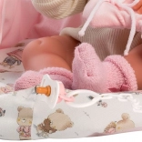 De pop is uitgerust met een stijlvolle outfit bestaande uit een body, een hoed, sokken, een jasje en een slaapslaapzak. De gehele outfit is gemaakt van kwalitatieve stoffen van gerenommeerde kindermerkkleding fabrikanten.