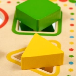 Drie stukjes bestaan uit twee delen. Het kind moet ze correct verbinden en tijdens het plaatsen draaien, waarmee logica en fijne motoriek worden getraind.