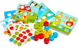 De verpakking biedt 12 dubbelzijdige kaarten: 6 geperforeerde gekleurde afbeeldingen die op de basis worden gelegd, en 6 gekleurde sjablonen voor het leggen van patronen direct op het bord. Dankzij de gladde afwerking en opvallende kleuren is het spel aantrekkelijk en veilig voor kinderen. De houten basis met afmetingen 14 × 14 × 1,5 cm is compact en gemakkelijk mee te nemen.