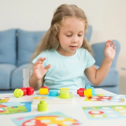 Deze educatieve mozaïek met grote pinnen is een ideale montessori-hulp voor de eerste training van de vingers en de oog-handcoördinatie. Kinderen plaatsen gekleurde pinnen in het houten bord volgens de sjablonen of maken hun eigen patronen, waarbij ze logisch denken, geduld en visuele waarneming oefenen.
