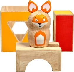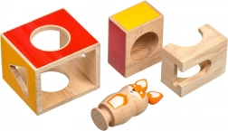 3 houten blokken met uitsparingen, houten vosfiguur, set opdrachtkaarten