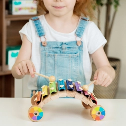 Vrolijke regenboogxylofoon op een houten onderstel met wieltjes die het muzikale gehoor, ritme en de fijne motoriek stimuleert. De gekleurde metalen lamellen produceren zuivere tonen; inbegrepen zijn 2 houten stokjes. De veilige uitvoering en robuuste afwerking maken het een ideale educatieve speelgoed voor kleuters.