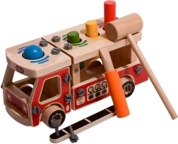 Deze creatieve set combineert een bouwset en hamerspel in één. Kinderen bouwen eerst een robuuste houten brandweerwagen en gebruiken vervolgens de vier openingen in de laadbak voor het leuk inslaan van gekleurde elementen met het hamertje. Dankzij de heldere kleuren en diverse vormen ondersteunt het speelgoed natuurlijk leren en concentratie.