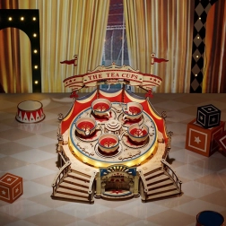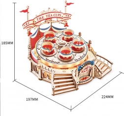 De elegante molen “Theekopjesmolen” verandert je interieur in een boeiend miniatuurpretpark. Het houten 3D-bouwpakket met gedetailleerde circusinrichting, een schuine draaiende basis en een halfcirkelvormige trap komt na montage echt tot leven: vijf kopjes draaien ritmisch, het podium draait soepel en alles wordt versterkt door sfeervolle LED-lampen en de zachte melodie Wind and Moon.