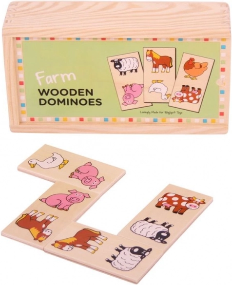 Het kleurrijke houten domino met boerderijthema van Bigjigs Toys is ideaal voor kleine kinderhandjes. Biedt tijdloos speelplezier en stimuleert behendigheid, vergelijken en concentratie. Alle steentjes berg je gemakkelijk op in een houten doosje met schuifdeksel. Bevat 28 steentjes gemaakt van hoogwaardig, verantwoord verkregen hout dat voldoet aan de Europese veiligheidsnormen.