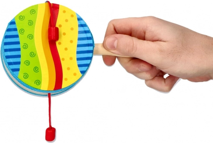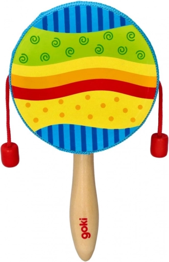 De traditionele “bedeltrom” in een modern jasje van GOKI is een geweldig begeleidingsinstrument voor kinderen. Draai aan het handvat en de rode kralen op de koordjes laten een ritmisch geluid horen op het trommelvel. De draaisnelheid verandert vanzelf het tempo en het karakter van het geluid, wat het gehoor en het ritmegevoel stimuleert.