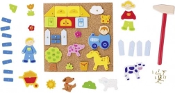 Het spel bevordert de fijne motoriek en creativiteit bij kinderen vanaf 3 jaar. Kinderen kunnen met de hamer en spijkers gemakkelijk houten vormen op de kurken plaat bevestigen en ze vervolgens weer losmaken, waardoor ze keer op keer opnieuw op een creatief avontuur gaan.