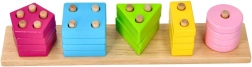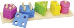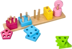 Een speelse houten puzzel die het sorteren van kleuren en vormen combineert met het rijgen op pinnetjes met een verschillend aantal gaten. Ontwikkelt fijne motoriek, oog-handcoördinatie en logisch denken, gemaakt van massief hout voor veilig en duurzaam spel.
