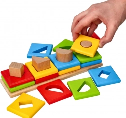 Massief hout en een robuuste afwerking zorgen voor een lange levensduur en veilig gebruik. De set bevat een basisplaat en 16 gekleurde vierkantjes, die je kunt stapelen, sorteren en combineren op vorm en kleur – ideaal voor Montessori-geïnspireerd leren thuis en in de kleuterklas.