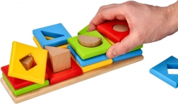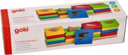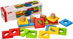 Deze kwalitatieve houten puzzel van het merk GOKI combineert leren en spelen. Vier zuilen met gekleurde vierkante stukjes en verschillende openingen (cirkel, driehoek, vierkant enz.) leren kinderen vormen en kleuren herkennen, terwijl ze oog-handcoördinatie en precisiebewegingen ontwikkelen.