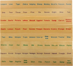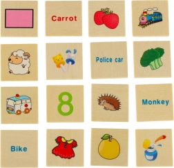 Kinderen plaatsen kleine kaartjes met afbeeldingen in de overeenkomstige sleuven onder de grote strook – ze trainen aandacht, logica en visuele discriminatie.