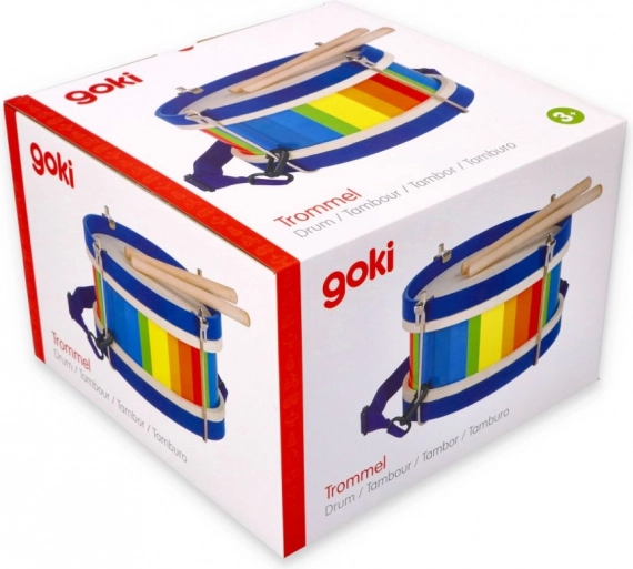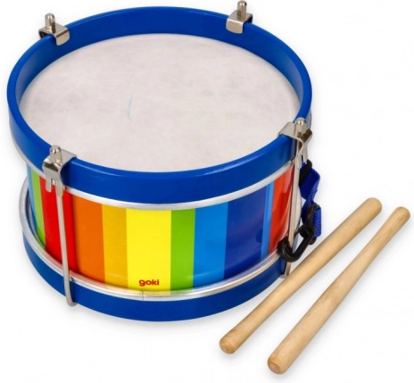 Kleurige trommel voor kleine muzikanten, die de ontwikkeling van ritmegevoel en motorische vaardigheden van kinderen stimuleert. Deze kwalitatieve trommel is uitgerust met twee houten stokjes en een verstelbare draagriem voor gemakkelijk meenemen.
