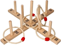Dit spel bevat een kruisvormige basis met 9 houten pinnen en vijf touwringen met een houten element voor gemakkelijk werpen. Het spel is gemaakt van hoogwaardig hout, wat zorgt voor langdurig speelplezier.