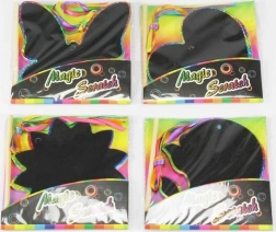 Eenvoudige werkwijze, groots effect – kras de voorbedrukte lijnen weg en onder de zwarte laag verschijnen regenboogkleuren. De afgewerkte plaatjes kun je dankzij de gekleurde lintjes meteen ophangen en de kinderkamer versieren. Ideaal om te knutselen thuis, op school of in clubs.