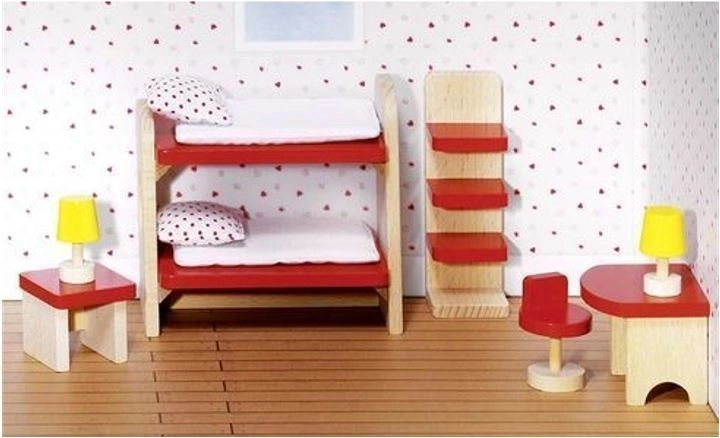 - Inhoud van de verpakking: 11 stuks meubels en accessoires (bijv. stapelbed, tafel, stoelen, plank, lampjes)