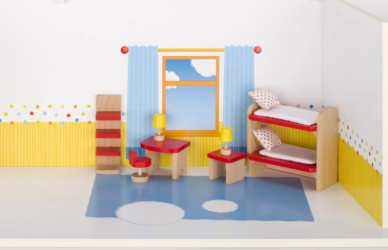 Een prachtige set houten poppenhuismeubels uit de serie GOKI Basic verandert elk poppenhuis in een knusse kinderkamer. Biedt een stevige massieve uitvoering, stabiele constructie en een rijke set van 11 stuks meubels en accessoires in een fijne combinatie van natuurlijk hout en rood. Perfect voor creatief en fantasierijk spel en compatibel met alle GOKI-poppenhuizen.