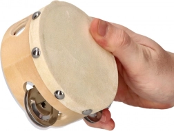 De tamburijn heeft een traditioneel uiterlijk met een natuurlijk houten lichaam en stevig bevestigde metalen bekkens.