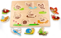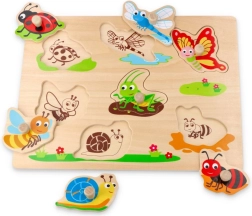 Deze houten inlegpuzzel met knopjes met insectenmotief is een ideale didactische speelgoedset voor de eerste kennismaking met vormen. Dankzij de comfortabele knopjes leren kinderen gemakkelijk met de stukjes omgaan, ontwikkelen ze hun fijne motoriek en oog-handcoördinatie.
