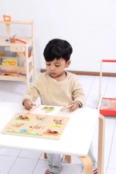 Ontdek de houten inlegpuzzel met knopjes met een insectenmotief, die de fijne motoriek, oog-handcoördinatie en het herkennen van vormen en kleuren stimuleert. Veilig uitgevoerd van hoogwaardig hout met CE-certificering en comfortabele knopjes voor kleine handjes.