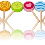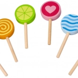 Elke van de zes houten lolly's heeft zijn eigen unieke ontwerp, dat de verbeelding en creativiteit van kinderen inspireert.