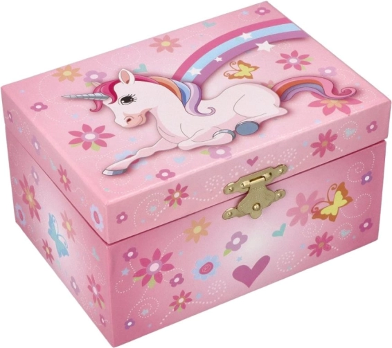 Deze sieradendoos in speeldoos-stijl tovert een glimlach op het gezicht van elke kleine dame. Binnenin vind je een spiegeltje en een schattig eenhoornfiguurtje dat bij het openen van het deksel begint te draaien op de melodie van Het Zwanenmeer. De binnenkant is gevoerd met een zachte stof, zodat kettinkjes, armbandjes en ringetjes veilig zijn opgeborgen.
