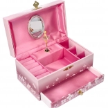 Deze charmante juwelendoos in de stijl van een speeldoos is perfect voor het veilig opbergen van kinderschatten – ringen, oorbellen en kleine souvenirs. Bij het openen van het deksel begint de ballerina voor het spiegeltje te draaien en klinkt de iconische melodie uit het Zwanenmeer. Het interieur is gevoerd en doordacht ingedeeld voor overzichtelijke opslag.
