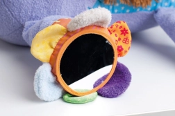 De knuffel bevat spiegelende elementen en zachte accessoires die interactieve spelletjes en de ontwikkeling van zelfbewustzijn stimuleren.