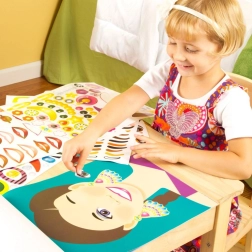 De set is ideaal om thuis te knutselen, voor in de kleuterklas en voor onderweg. Hij stimuleert de verbeelding en de fijne motoriek en helpt kinderen emoties en mimiek te herkennen. In de verpakking vind je 20 kleurrijke gezichtssjablonen en 5 vellen met tal van stickers van gelaatskenmerken en accessoires.