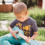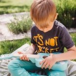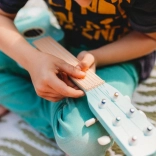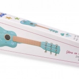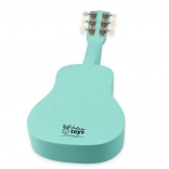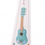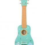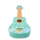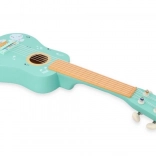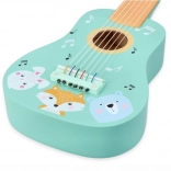 Schattige houten kindergitaar in turquoise met dierenillustraties die kleine muzikanten motiveert om de wereld van muziek te ontdekken. Biedt een duurzame houten constructie, echte snaren en makkelijk houvast, ideaal voor de eerste muzikale probeersels en de ontwikkeling van ritmegevoel en creativiteit.