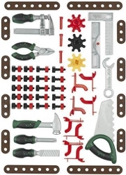 Zaag, hamer, sleutels, tangen, vijltjes, schroeven en koppelingen – alles wat een kind nodig heeft om te bouwen en te schroeven.