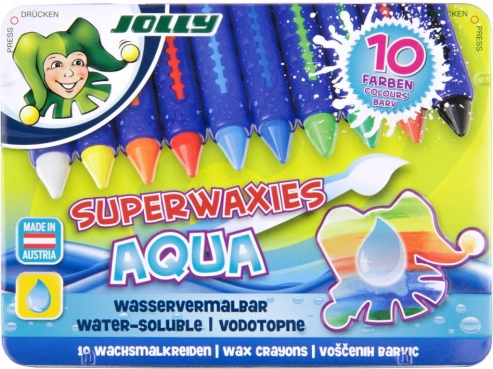 Onbreekbare waskrijtjes AQUA in een praktische metalen doos voor kleine makers vanaf 3 jaar. Ze bieden heldere en intense kleuren, zijn breukbestendig en voldoen aan de CE-certificering. Dankzij de compacte afmetingen van 14 × 10 cm passen ze gemakkelijk in rugzak en etui.
