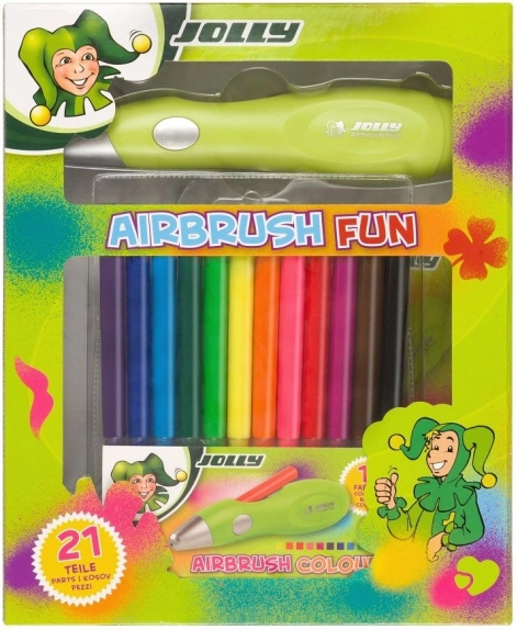 De JOLLY airbrush-pen verandert elk papier, karton of textiel in een uniek kunstwerk. Dankzij de elektrische verneveling van de kleur bereikt u vloeiende overgangen, arceringen en precieze lijnen zonder moeite. De leuke sjablonen met letters, cijfers en motieven maken de start eenvoudig en stimuleren de fantasie van kinderen.