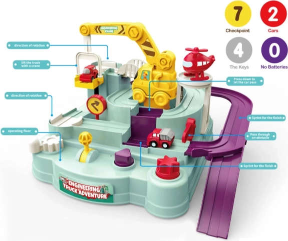 • Twee autootjes in de set: organiseer een race en word de kampioen van de baan.