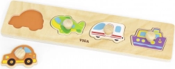 Vrolijke kleuren en duidelijke contouren helpen het visuele waarnemen en de woordenschat te ontwikkelen – het kind leert auto, boot, vliegtuig en caravan herkennen en benoemen. De hoogwaardige houten afwerking staat garant voor een lange levensduur en veilig spelen.
