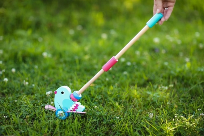 Dit mooie houten duwvogeltje is ontworpen om kinderen vanaf 12 maanden te helpen bij de ontwikkeling van motoriek en evenwicht. Dankzij de afneembare stok van 48 cm is het speelgoed gemakkelijk te duwen en te hanteren. Het totale design combineert een turquoise lichaam en roze vleugels, wat de verbeelding en het kleurgevoel van kinderen stimuleert.