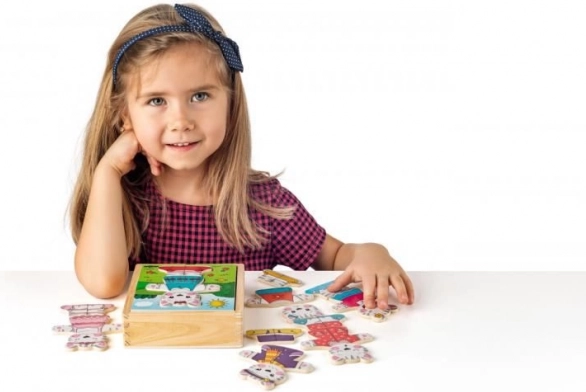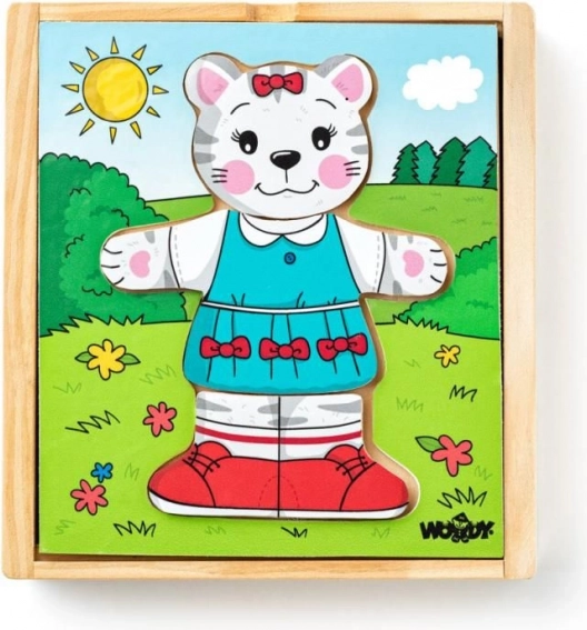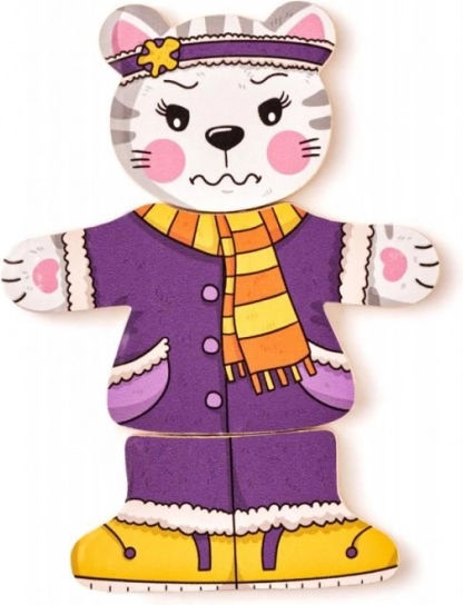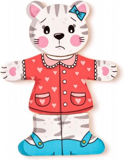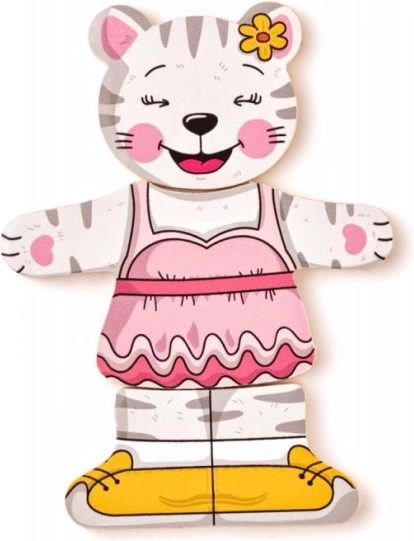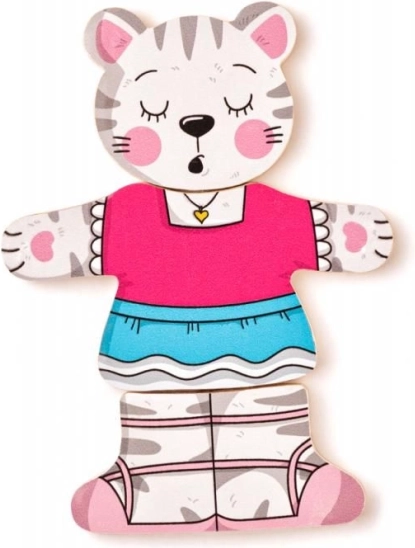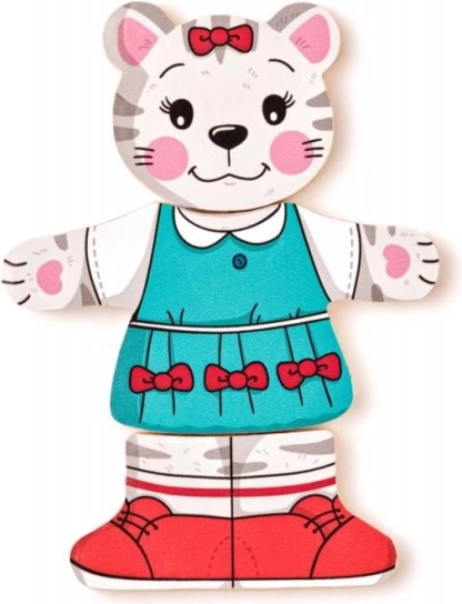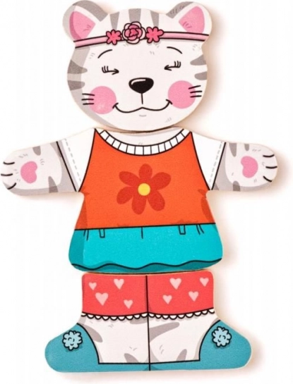 Geef kinderen de magie van verkleden en puzzelen met deze houten katjespuzzel. De delen van kop, lijf en pootjes zijn vrij te combineren, zodat kleine makers ontelbare vrolijke outfits kunnen samenstellen. Het spel ondersteunt op een natuurlijke manier de ontwikkeling van fijne motoriek, oog-handcoördinatie en het herkennen van vormen en kleuren.