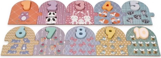 Deze kwalitatieve houten legpuzzel combineert plezier en leren. Elk cijfer 1–10 heeft een eigen kaartje met schattige dieren in het bijbehorende aantal, zodat het kind eenvoudig het verband tussen cijfer en hoeveelheid begrijpt. De verhoogde, gekleurde cijfers liggen prettig in kleine kinderhandjes en ondersteunen de ontwikkeling van de fijne motoriek en het visuele waarnemen.