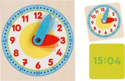 Een leuk en praktisch leersetje waarmee kinderen gemakkelijk uren, minuten leren herkennen en voormiddag/namiddag én analoge en digitale tijd leren onderscheiden. Een klok met verschuifbare wijzers op het deksel van het doosje en 12 dubbelzijdige houten kaartjes ondersteunen spelenderwijs leren en de ontwikkeling van logisch denken. Gemaakt van hoogwaardig hout met ongevaarlijke verven.