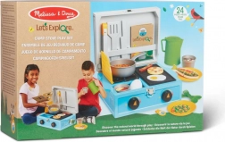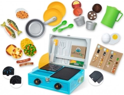 De kinderspeelgoed kampeerset met keukentje brengt onbeperkte mogelijkheden voor fantasie en plezier in het spel van kinderen. Deze set bevat diverse onderdelen, waaronder speelpannetjes en -servies en speelgoedeten, opgeborgen in een draagbare box, ideaal voor spelen buiten bij een picknick.