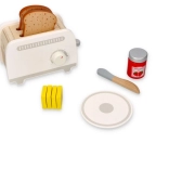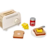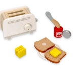 Deze kwalitatieve houten broodrooster (kinder-tosti-/toastapparaat) is een geweldige aanvulling voor elke kinderkeuken. Kinderen kunnen de “bruiningstand” instellen met de draaiknop, de hendel indrukken en ontbijt serveren met brood, boter en aardbeienjam. Het spel stimuleert verbeelding, concentratie en samen spelen.